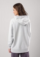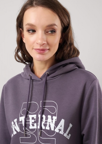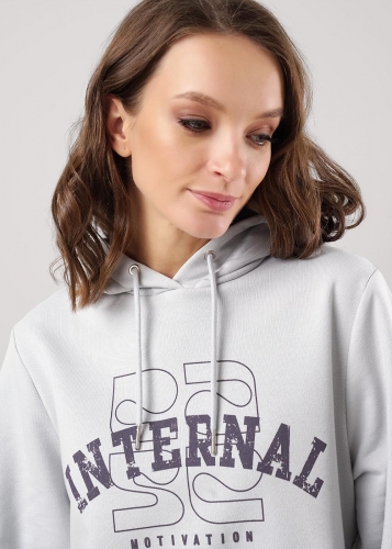 Джемпер для спорта и отдыха из футера 3х нитки с хлопком в составе. Капюшон двойной со шнуром. Длинный рукав со спущенной линией плеча. По низу рукавов манжеты из кашкорсе. На полочке принт вспенка, по низу рукава принт.