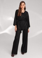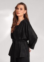 Блузка-кимано из трикотажного полотна с блеском. Спущенный рукав, внизу тритачной манжет. По борту притачная планка. По бокам разрезы. Сьемный пояс.