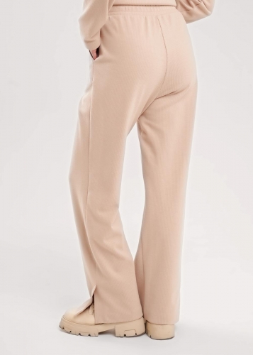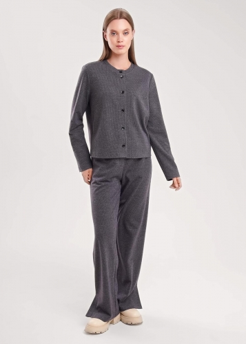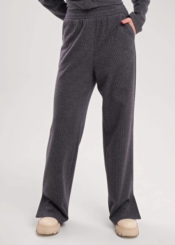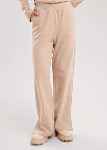 Брюки широкие из трикотажного поливискозного полотна джерси. По талии пояс на внутренней резинке. Спереди имитация гульфика. Боковые карманы с отрезным бочком. Боковые шлицы, по низу изделия потайной стежок.