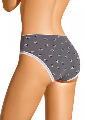 Трусы слипы женские из эластичного хлопкового полотна. Обработка краев по талии - резинка с кантом, по ноге - узкое кружево. По переду сборка на резинку, атласный бант.