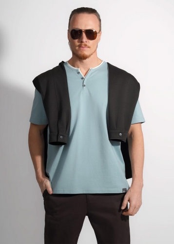 Футболка из трикотажного плотного хлопкового полотна с воротником-стойка и декоративной планкой на пуговицах. Модель дополнена имиджевой фурнитурой. Отличный вариант на каждый день.