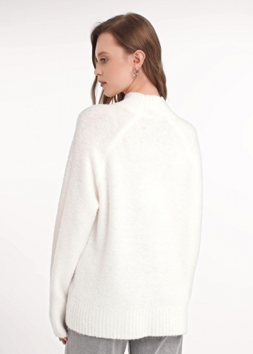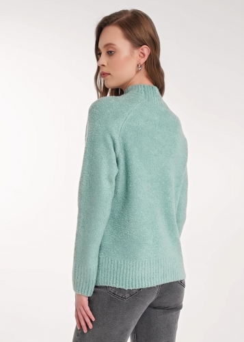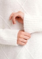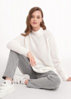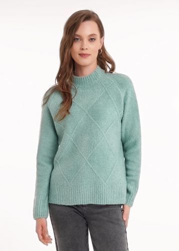 Вязаный джемпер свободного силуэта из акриловой пряжи.Основное переплетение изнаночная гладь, спереди вывязанный рельефный рисунок в виде ромбов. Длинный рукав реглан. По низу рукава и изделия манжеты. Округлая горловина с полустойкой.