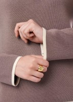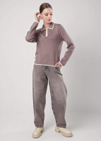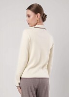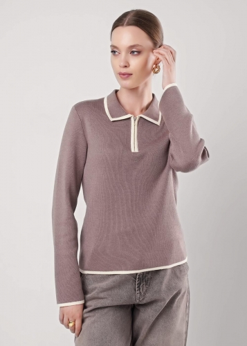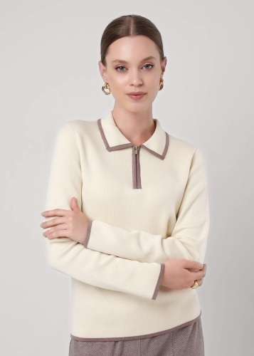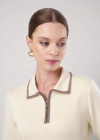 Вязаный джемпер прямого силуэта из хлопковой пряжи с добавлением акрила. Длинный втачной рукав. Основное переплетение гладь. По горловине отложной воротник с застежкой на молнию. По воротнику, планке, низу изделия и рукавов контрастные полоски.