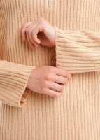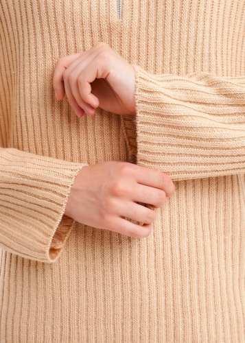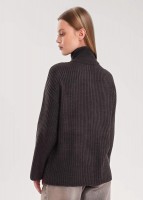 Вязаный джемпер умеренного объема из акриловой пряжи с добавлением шерсти, переплетения полуфанг. Спущенный длинный рукав. По горловине стойка с застежкой на молнию.