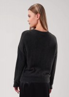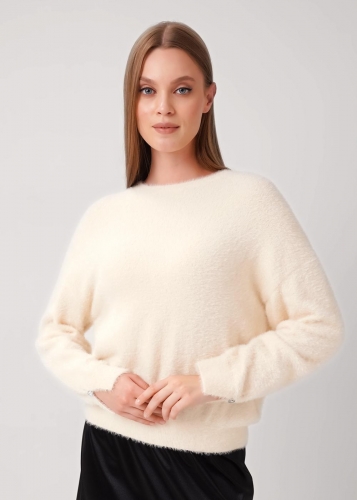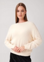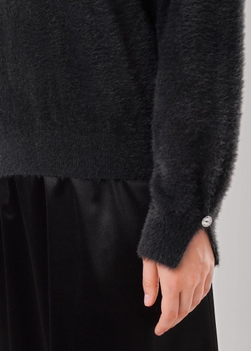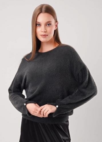 Вязаный джемпер умеренного объема, из фасонной пряжи травка, переплетение гладь. Спущенная линия плеча, длинный рукав. Округлая горловина с бейкой. По низу изделия и рукавов узкие манжеты. По низу рукава разрез с пуговицей.