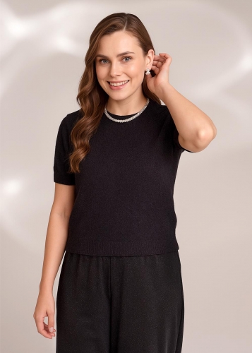 Вязаный джемпер свободного силуэта,из синельной пряжи переплетения гладь. Короткий втачной рукав. Округлая горловина с бейкой. По низу изделия и рукавов манжеты.