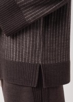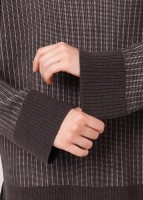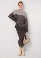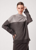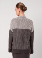 Вязаный джемпер из акриловой пряжи, свободного силуэта. Округлая горловина с бейкой. Длинный рукав со спущенной линией плеча. Контрастная кокетка. По низу изделия и рукавов манжеты. Боковые разрезы.