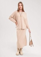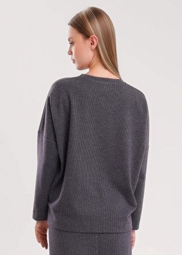 Джемпер свободного кроя из трикотажного поливискозного полотна джерси. Спущенный длинный рукав. Округлая горловина с обтачкой. Спереди резы с разным направлением полос. Боковые разрезы. По низу рукава и изделия потайной стежок.