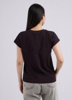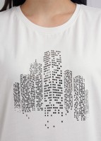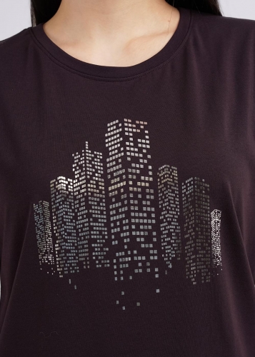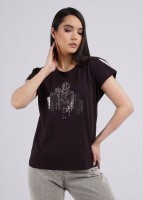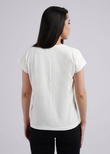 Джемпер из эластичного хлопкового полотна. Короткий цельнокроеный рукав. Круглый вырез горловины. По переду принт фольгой.
