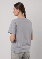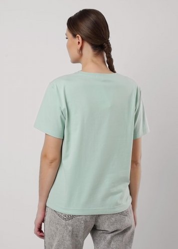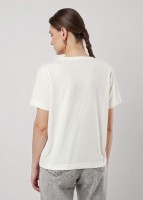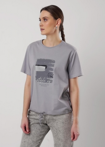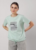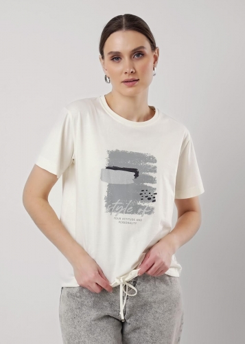 Джемпер из хлопкового трикотажного полотна. Короткий спущенный рукав. Округлый вырез горловины с обтачкой из рибаны. По низу кулиса. По переду принт с шиммером.