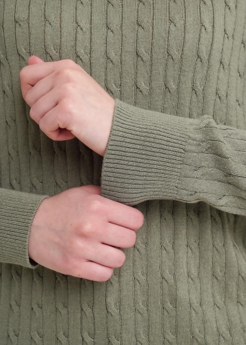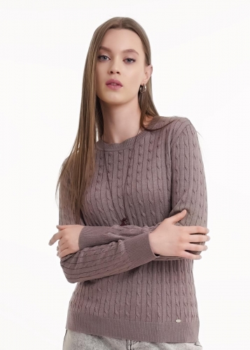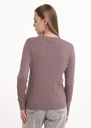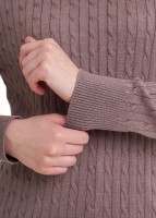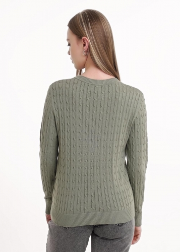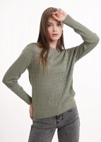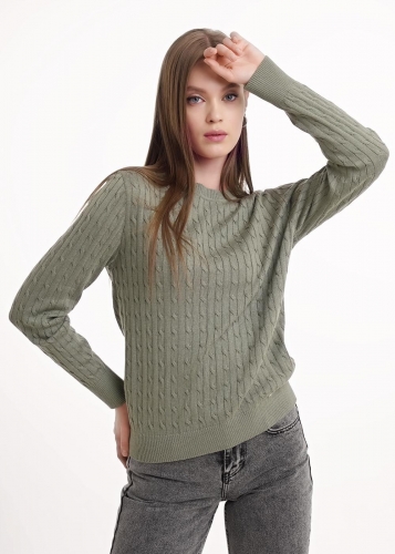 Вязаный джемпер прямого силуэта из хлопковой пряжи с добавлением акрила, переплетение косы. Втачной длинный рукав. Округлая горловина с бейкой. По низу изделия и рукавов манжеты.