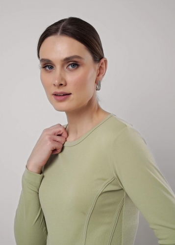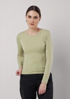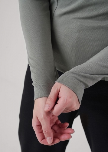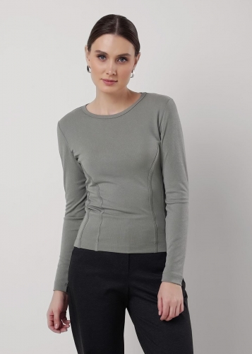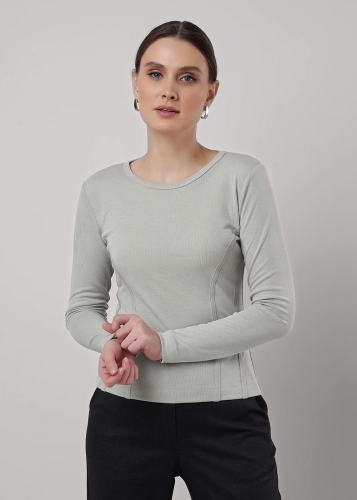 Фуфайка прямого силуэта из трикотажного полотна рибана. Округлая горловина с окантовкой. Длинный втачной рукав. По переду декоративные бейки из основного полотна.