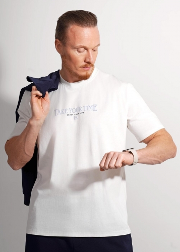 Мужская футболка из дышащего трикотажного хлопкового полотна. Модель дополнена авторским шрифтовым принтом. Отличный вариант для динамичных мужчин.