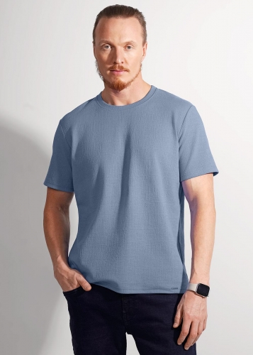 Футболка мужская из трикотажного полотна жаккард. Модель с круглым вырезом горловины, коротким втачным рукавом. Прекрасно сочетается с джинсами или шортами. Модель дополнена нашивкой и имиджевой фурнитурой.