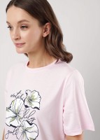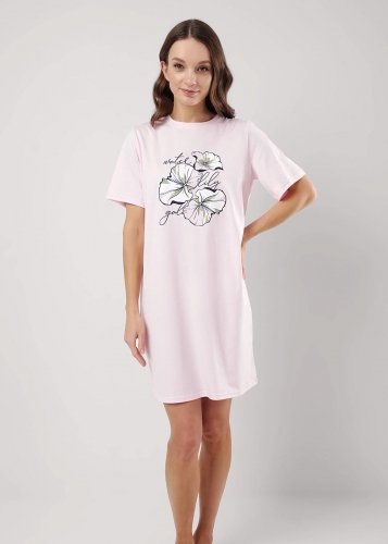 Платье-футболка для дома прямого силуэта, из хлопоковго трикотажного полотна с добавлением модала. Короткий втачной рукав. Округлая горловина с обтачкой. Спереди принт.