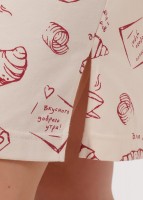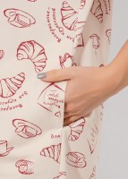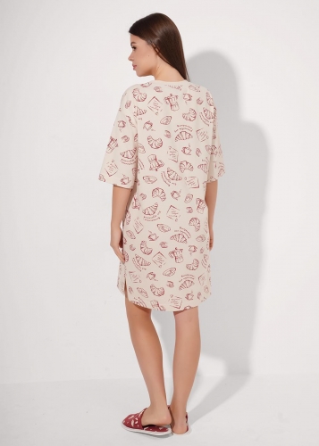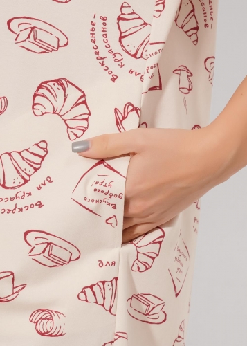 Платье для дома и отдыха прямого силуэта из хлопкового трикотажного полотна. Округлая горловина с обтачкой. Втачной короткий рукав. Спереди принт. Боковые карманы в швах. По бокам разрезы.