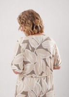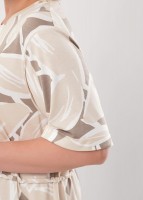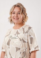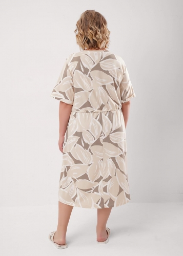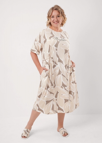 Платье из хлопкового трикотажного полотна с добавлением модала, прямого силуэта. По переду рельефы. Отрезное по линии талии с кулисой и завязками. Горловина с обтачкой. Короткий втачной рукав с отворотом. Сзади по юбке средний шов. Боковые карманы в шве.