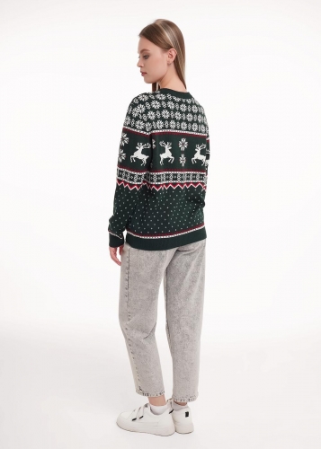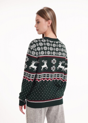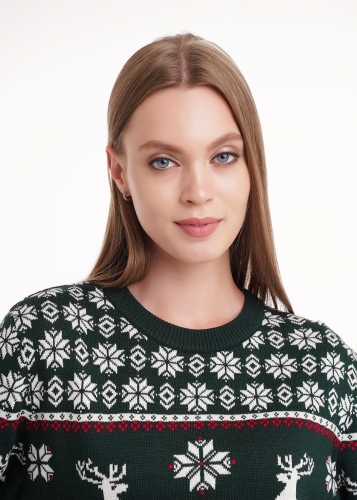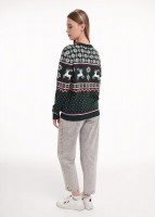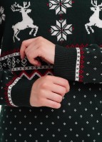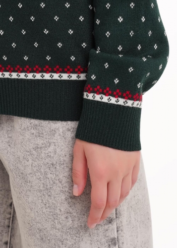 Вязаный джемпер прямого силуэта, жаккардового переплетения из акриловой пряжи. Втачной длинный рукав. Округлая горловина с бейкой. По низу изделия и рукавов манжеты.
