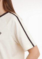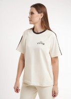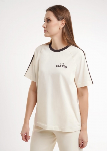 Футболка спортивная свободного силуэта из хлопкового трикотажного полотна. Короткий рукав реглан. По линии плеча тесьма. Округлая горловина с обтачкой из рибаны. Спереди принт.