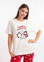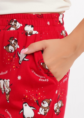 Набор одежды из трикотажного полотна.Футболка прямого кроя. Короткий втачной рукав с отворотом и закрепкой. По горловине обтачка.Спереди принт с помпоном, вшивка в боковом шве.Брюки с поясом на резинке.Боковые карманы с отрезным бочком.Внизу брюк манжет.