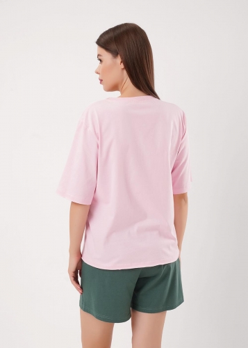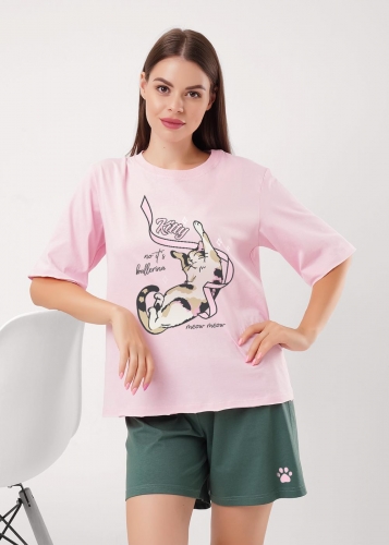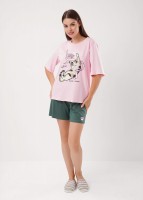 Набор одежды из хлопкового трикотажного полотна. Футболка прямого кроя. Короткий втачной рукав. Округлая горловина с обтачкой. Спереди принт. По низу рукава и изделия необработанный срез. Шорты с поясом на внутренней резинке, внизу принт.
