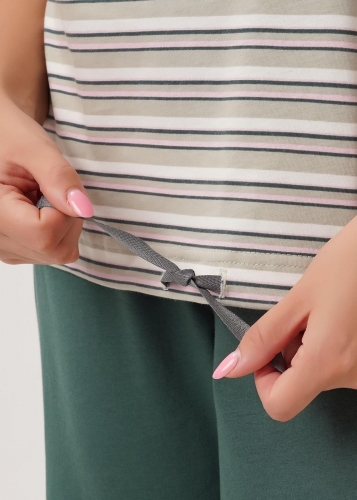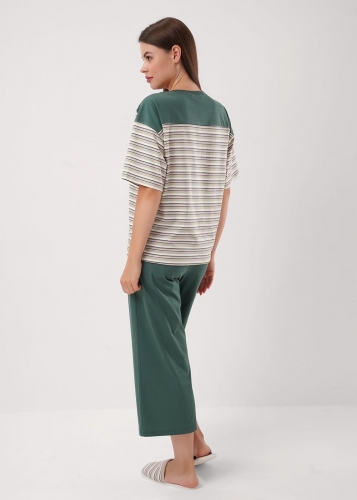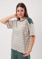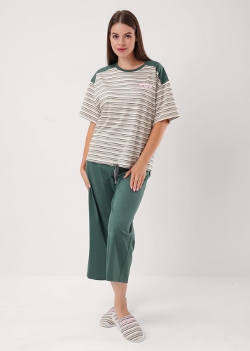 Набор одежды из хлопкового трикотажного полотна. Футболка прямого кроя. Короткий спущенный рукав. Округлая горловина с обтачкой. По спинке контрастная кокетка. Спереди принт. По низу изделия кулиса. Бриджы с поясом на внутренней резинке, принт.