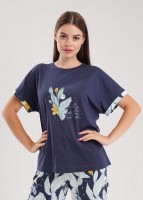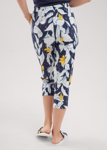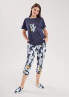 Набор одежды из хлопкового трикотажного полотна с модалом. Футболка с коротким цельнокроеным рукавом, по низу узкий манжет. По горловине обтачка. Спереди принт. Бриджи с поясом на резинке,атласной лентой. Боковые карманы с отрезным бочком. Внизу манжет.