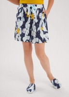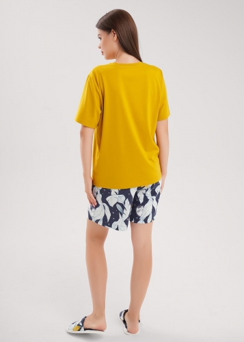 Набор одежды из хлопкового трикотажного полотна с модалом. Футболка с коротким спущенным рукавом. V-образный вырез горловины с обтачкой. Спереди принт. Шорты удлиненные, с поясом на резинке, атласной лентой. Боковые карманы с отрезным бочком.