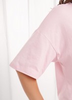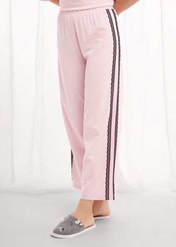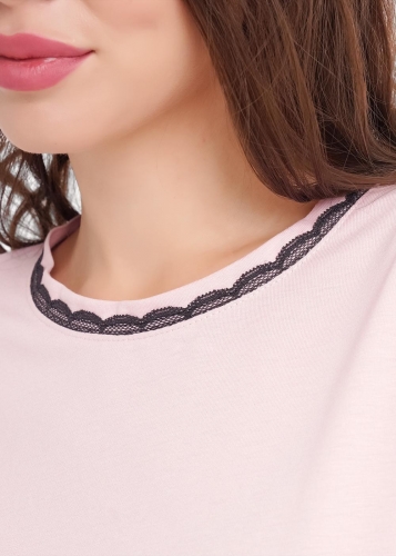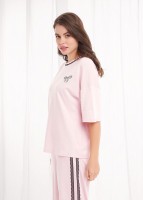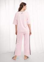 Набор одежды из хлопкового трикотажного полотна с модалом. Футболка прямого кроя. Короткий спущенный рукав. По горловине обтачка с кружевом. Спереди нашивка, сзади принт. Брюки прямые с поясом на внутренней резинке. По боковым швам узкое кружево, 2 ряда.