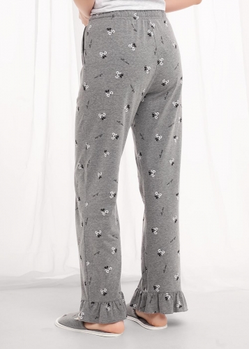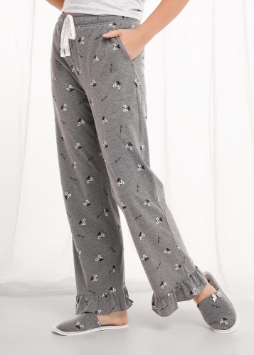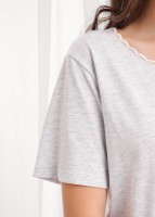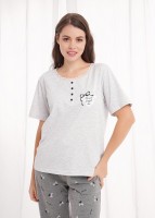 Набор одежды из трикотажного полотна. Футболка прямого кроя. Короткий втачной рукав. По горловине переда кружево, с планкой по центру и пуговицами, принт.Брюки с поясом на резинке и тесьмой из кружева.Боковые карманы с отрезным бочком. По низу брюк рюша.