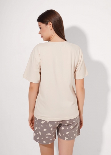 Набор одежды из хлопкового трикотажного полотна. Футболка прямого кроя. Короткий втачной рукав. Округлая горловина с обтачкой. Спереди принт. Шорты с поясом на внутренней резинке. Боковые карманы с отрезным бочком, спереди нашивка.