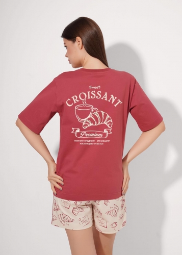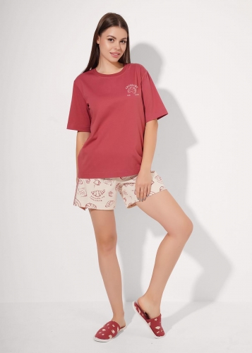 Набор одежды из хлопкового трикотажного полотна. Футболка прямого кроя. Короткий втачной рукав. Округлая горловина с обтачкой. Спереди и по спинке принт. Шорты с поясом на внутренней резинке. По боковому шву -лампас из тесьмы, спереди нашивка.