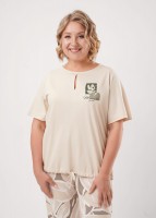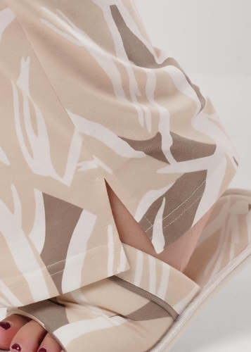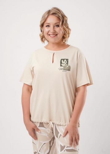 Набор одежды из трикотажного полотна с модалом.Джемпер по горловине внутренняя оркантовка.Спереди рез с разрезом вверху. Короткий втачной рукав. Внизу изделия кулиса,спереди принт.Брюки с поясом на резинке.Боковые карманы с отрезным бочком,внизу разрезы.