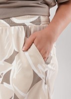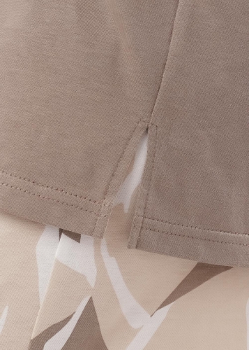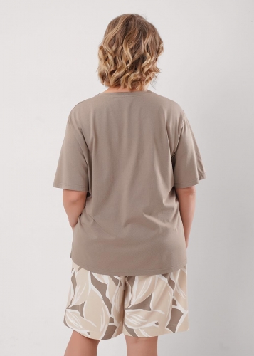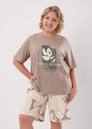 Набор одежды из хлопкового трикотажного полотна с добавлением модала. Футболка прямого кроя, короткий втачной рукав. Округлая горловина с обтачкой. Спереди принт. Боковые разрезы. Шорты с поясом на внутренней резинке. Боковые карманы с отрезным бочком.