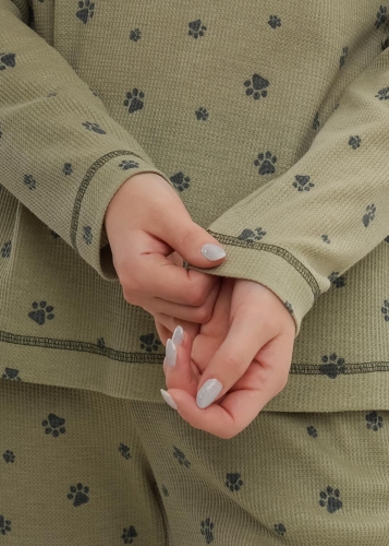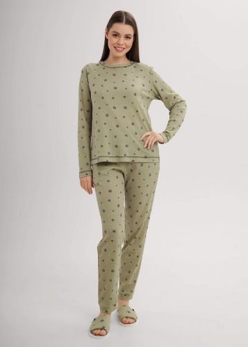 Набор одежды из трикотажного полотна вафелька. Фуфайка прямого силуэта.По горловине обтачка. Втачной длинный рукав. По горловине,низу изделия и рукавов застил. Брюки с притачным поясом на внутренней резинке. Боковые карманы в швах. По низу брюк манжет.