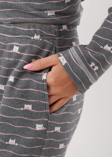 Набор одежды из трикотажного полотна вафелька. Фуфайка прямого силуэта.По горловине обтачка. Втачной длинный рукав. По горловине,низу изделия и рукавов застил. Брюки с притачным поясом на внутренней резинке. Боковые карманы в швах. По низу брюк манжет.