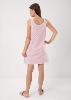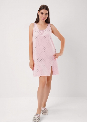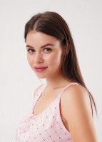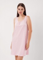 Ночная сорочка из хлопкового трикотажного полотна с добавлением эластана. А-образного силуэта на бретелях. Округлая горловина. По горловине и пройме окантовка с фестоном, спереди по центру горловины бант. По низу изделия мелкий оверлок, разрез.