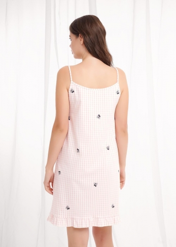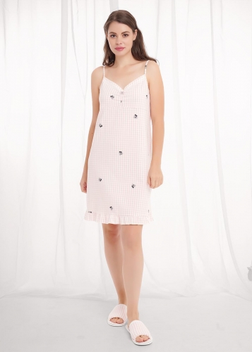 Ночная сорочка из хлопкового трикотажного полотна с добавлением эластана. А-силуэта на узких бретелях. По горловине переда обтачка с кружевом, бант. Отрезной лиф со сборкой. По пройме окантовка. По низу изделия рюша.