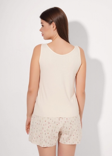 Набор одежды для дома и отдыха из трикотажного полотна кашкорсе. Майка на бретелях. По горловине и пройме окантовка. Спереди принт. Шорты с поясом на внутренней резинке. По низу майки и шорт мелкий оверлок.