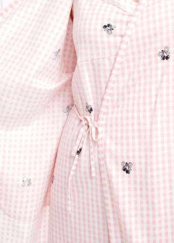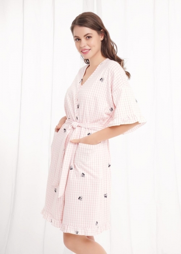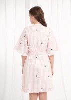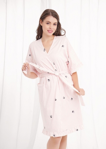 Халат из трикотажного полотна свободного кроя, на запах. По талии пояс со шлевками и внутренними завязками. По горловине и борту окантовка. Спущенная линия плеча, с коротким рукавом. По бокам накладные карманы. По низу рукава и изделия -рюша.
