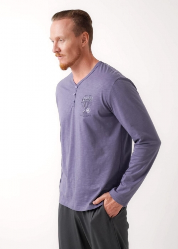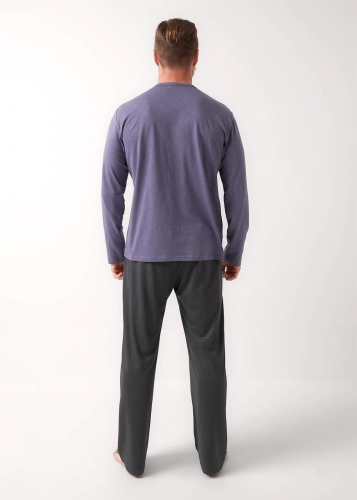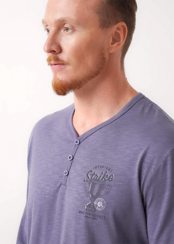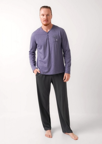 Набор мужской состоящий из джемпера и брюк. Джемпер из фактурного полотна флам с декоративной планкой на пуговицы и с имиджевой нашивкой. Брюки из фактурного полотна - пике на широком поясе с резинкой и регулируемым шнуром, по бокам удобные карманы.