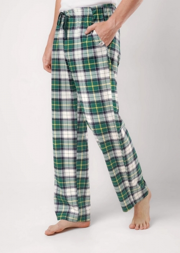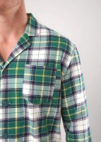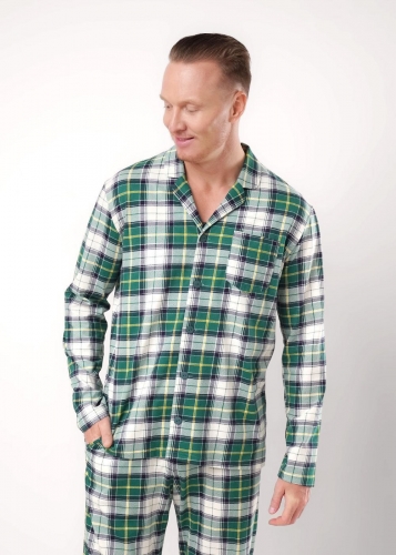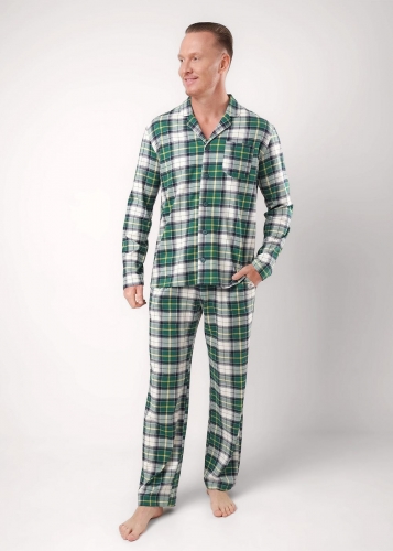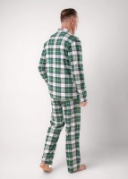 Пижама в оригинальную клетку из мягкого трикотажа с карбоном. Жакет с застежкой на пуговицы и отложным воротником и карманом. Прямые брюки с эластичным поясом, шнуром для регулировки по размеру и двумя функциональными карманами по бокам.
