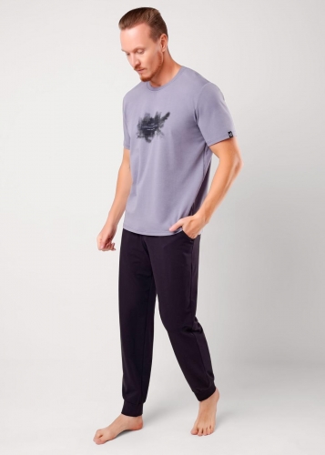 Набор состоящий из футболки и брюк. Футболка из хлопковой кулирной глади с добавлением эластана с коротким рукавом и принтом. Брюки из плотной хлопковой кулирной глади с добавлением эластана на широком поясе с резинкой и шнуром, по бокам карманы.