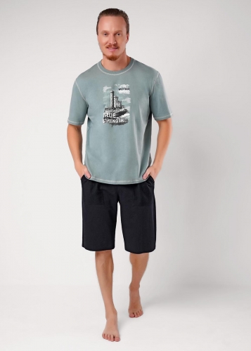 Набор, состоящий из футболки и шорт. Футболка из хлопковой кулирной глади с круглым вырезом горловины, коротким рукавом и стильным принтом. Шорты из футера на эластичном поясе с функциональными карманами и шнуром.