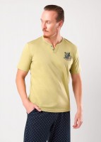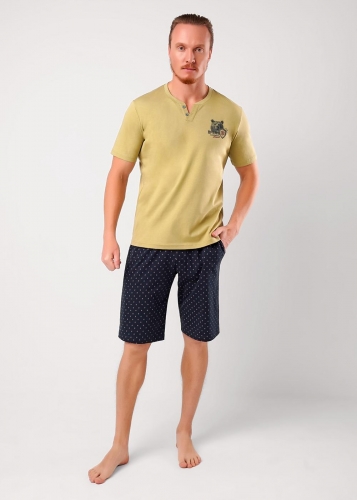 Набор мужской для дома состоящий из футболки и шорт. Футболка из кулирной глади с фигурной горловиной, коротким рукавом и принтом. Шорты из набивной кулирной глади на эластичном поясе с функциональными карманами и шнуром.