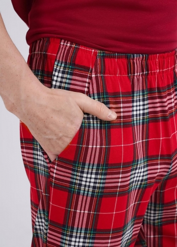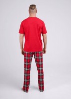 Комплект мужской для дома состоящий из футболки и брюк. Футболка из трикотажного полотна с коротким рукавом и крупным принтом. Прямые брюки из клетчатого полотна с карбоном на широком поясе с резинкой, шнуром и боковыми карманами.