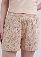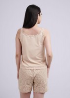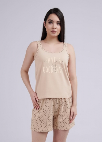 Пижама для дома из трикотажного полотна. Майка прямого силуэта, спереди принт. Узкие бретели. Горловина и проймы обработаны обтачками. Короткие шорты свободного кроя, цельнокроеный пояс на внутренней резинке.