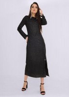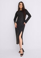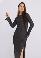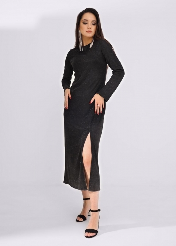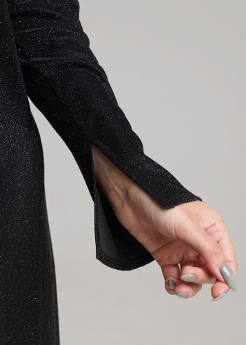 Платье вечернее полуприлегающего силуэта из трикотажного полотна с блеском. Округлая горловина. Длинный втачной рукав, по низу рукава разрезы. На детали переда разрез от середины бедра. По спинке средний шов, вверху щель с застёжкой на пуговицу.