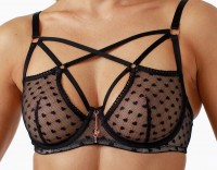 Бюстгальтер мягкая чашка на каркасах со стрепами. Выполнен из эластичной сетки с декоративными сердечками. Украшение: медальон с логотипом COQUETTE REVUE и ключ на цепочках.