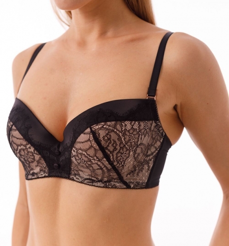 Бюстгальтер с формованными чашками из тонкого поролона со скрытыми каркасами. Выполнен из сетки и кружева. По бокам вертикальные пластины упругости. Бретели съемные с регулировкой.